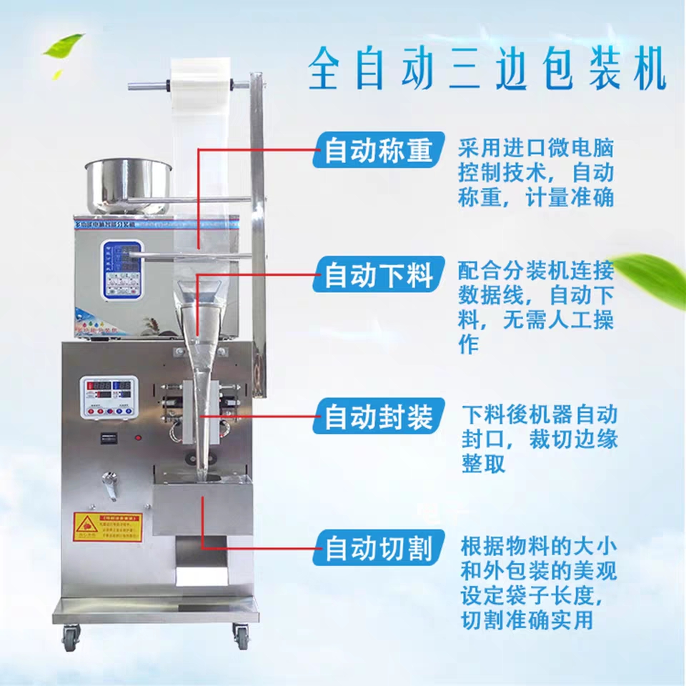 包裝機采用國內(nèi)先進高智能微電腦控制技術(shù),是我司新款研發(fā)生產(chǎn)的小型全自動包裝機械設(shè)備,包裝美觀,精度高速度快。適合食品、醫(yī)藥、化工產(chǎn)品中的松散、無粘性細小顆粒狀、物料的自動包裝,如干燥劑、味精、洗衣粉、茶葉、白糖、食鹽、種子、咖啡、飲料、沖劑、麥片等。